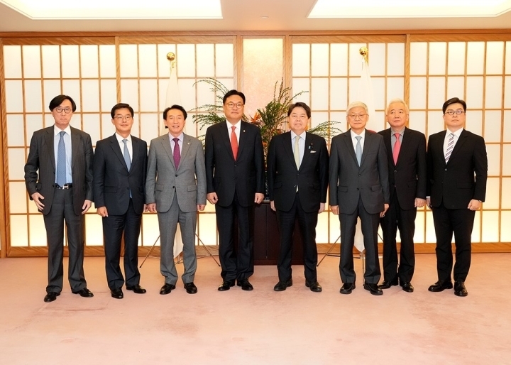 [서울=뉴시스]하야시 요시미사 일본 외무상(왼쪽에서 4번째)은 25일 도쿄(東京) 외무성에서 윤석열 대통령 당선인이 파견한 '한일 정책협의 대표단'과 면담했다. 사진은 일본 외무성 공식 트위터 계정(@MofaJapan_jp) 갈무리. 2022.04.25. *DB 및 재판매 금지. |