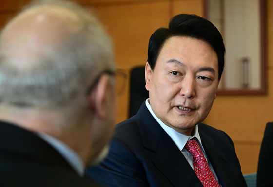 (서울=뉴스1) 인수위사진기자단 = 윤석열 대통령 당선인이 27일 오전 서울 종로구 통의동 대통령직인수위원회 접견실에서 필립 르포르 주한 프랑스 대사를 접견하고 있다. 2022.4.27/뉴스1 |