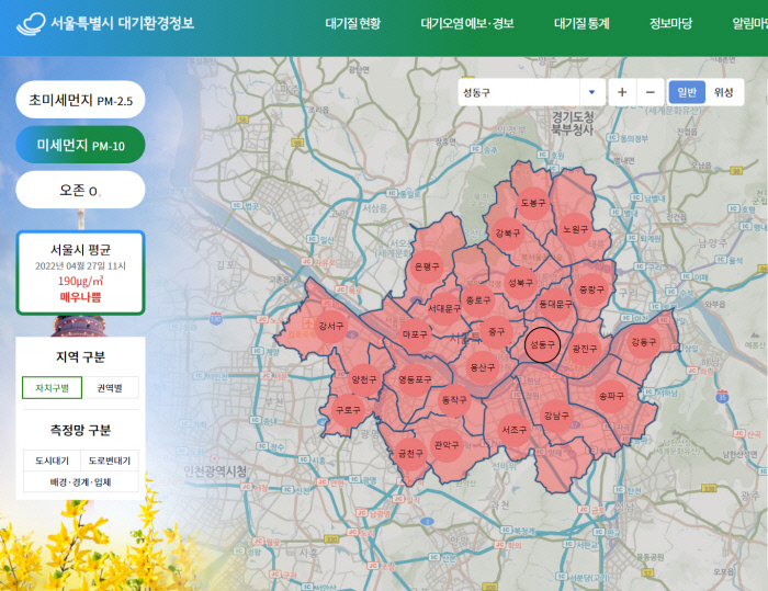 27일 오전 11시 현재 서울의 미세먼지 현황. 빨간색은 매우나쁨 수준 이상의 농도를 의미한다. 서울시 제공. |