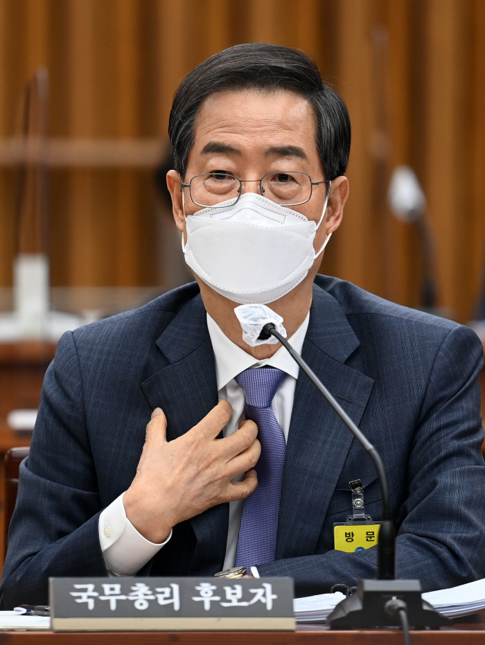 한덕수 국무총리 후보자가 2일 국회에서 열린 인사청문회에서 의원질의에 답변하고 있다. 국회사진기자단 |