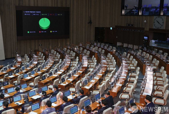 [서울=뉴스핌] 최상수 기자 = 3일 서울 여의도 국회에서 열린 본회의에서 국민의힘 의원들이 형사소송법 개정안에 대한 항의로 퇴장한 가운데 사법개혁 특별위원회 구성결의안(위원회안)이 가결되고 있다. 2022.05.03 kilroy023@newspim.com |