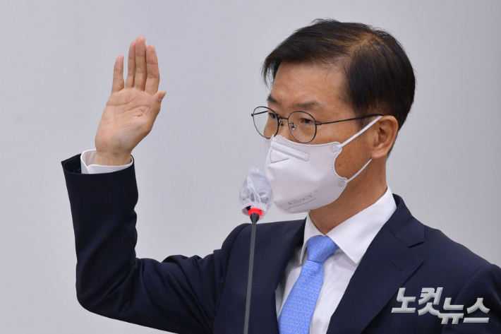 이정식 고용노동부 장관 후보자가 4일 서울 여의도 국회에서 열린 인사청문회에 출석해 선서를 하고 있다. 윤창원 기자 |