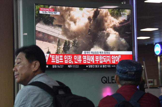 2018년 5월 북한이 풍계리 핵실험장을 폭파했다고 밝혔을 당시 한국 방송 모습. 사진 AFP |