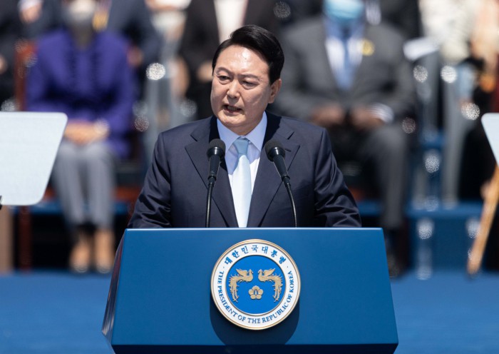 [서울=뉴스핌] 국회사진취재단 = 윤석열 대통령이 10일 오전 국회 앞 잔디마당에서 열린 제20대 대통령 취임식에서 취임사를 하고 있다. 2022.05.10 photo@newspim.com |