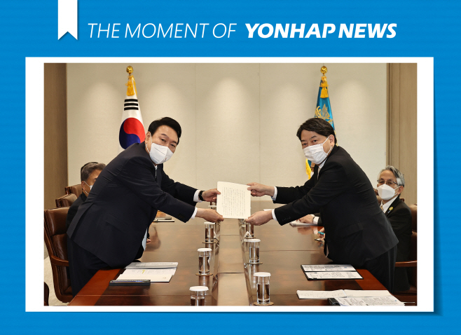 10일 용산 대통령 접견실에서 하야시 요시마사 일본 외무상이 윤석열 대통령에게 기시다 후미오 일본 총리의 친서를 전달하고 있다./사진=연합뉴스 |