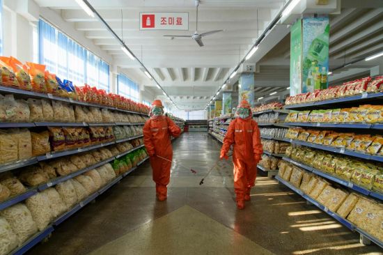 북한 평양의 역전백화점 직원들이 코로나19 예방 조치의 일환으로 매장에 소독제를 살포하고 있다. [이미지출처=연합뉴스] |