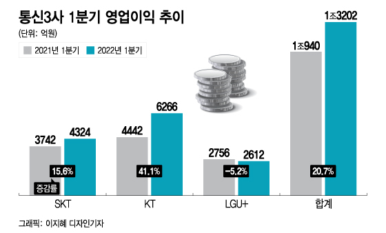 15일 SK텔레콤·KT·LG유플러스의 올해 1분기 실적을 종합한 결과, 3사의 합산 영업이익은 1조3202억원으로 집계됐다. 이는 지난해 1분기보다 20.7%(2262억원) 늘어난 결과다. 계절적 비용 영향이 컸던 작년 4분기(7543억원) 다소 주춤했지만, 다시 1조원대를 회복한 것은 물론 '두 자릿수' 성장을 과시했다.