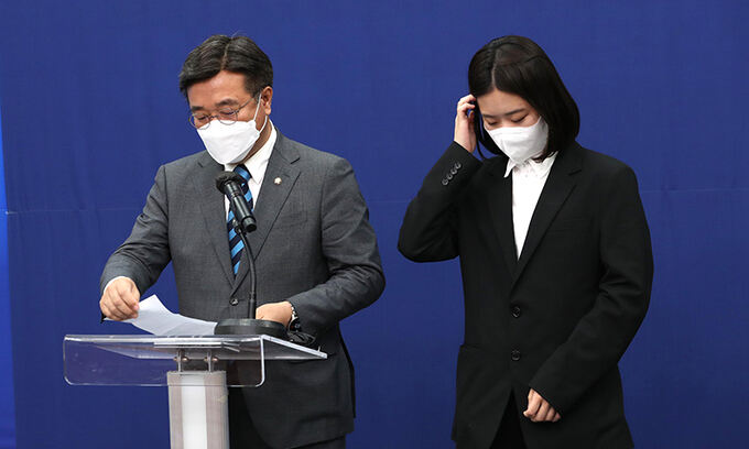 더불어민주당 박지현·윤호중 공동비상대책위원장이 12일 서울 여의도 국회에서 성비위 사건으로 제명된 박완주 의원과 관련해 민주당의 입장을 밝히고 공식 사과하고 있다. 국회사진기자단 |