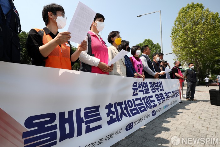 [서울=뉴스핌] 정일구 기자 = 최저임금연대 관계자들이 17일 오전 서울 용산구 대통령 집무실 인근에서 윤석열 정부의 올바른 최저임금제도 운용 촉구 기자회견을 하고 있다. 2022.05.17 mironj19@newspim.com