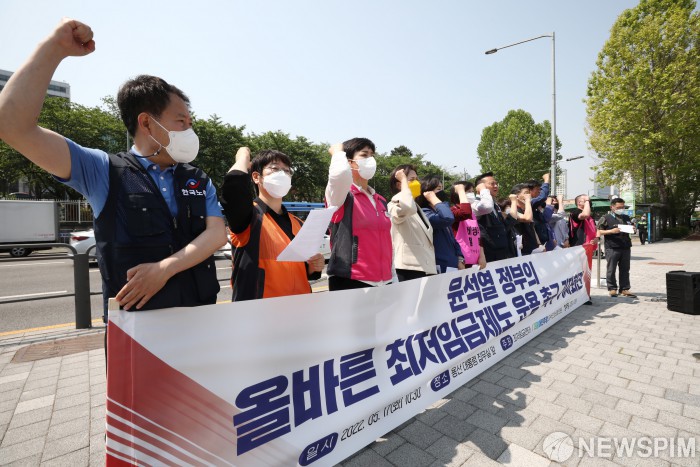 [서울=뉴스핌] 정일구 기자 = 최저임금연대 관계자들이 17일 오전 서울 용산구 대통령 집무실 인근에서 윤석열 정부의 올바른 최저임금제도 운용 촉구 기자회견을 열고 구호를 외치고 있다. 2022.05.17 mironj19@newspim.com