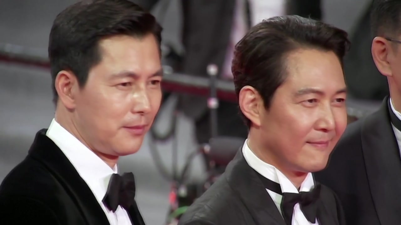 칸 영화제 레드 카펫을 밟은 배우 이정재와 정우성은 관객의 환영 인사와 박수갈채 속에 상영관에 입장했습니다.