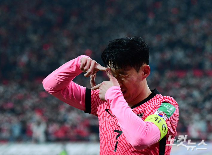 축구 대표팀 손흥민이 24일 오후 서울 마포구 월드컵경기장에서 열린 '카타르 월드컵' 최종예선 이란과의 경기에서 선제골을 성공시킨 후 세리머니 하고 있다. 황진환 기자손흥민(30, 토트넘 홋스퍼)이 잉글랜드 프리미어리그 득점왕 타이틀과 함께 벤투호에 합류한다.