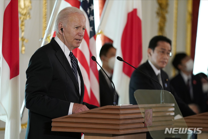 [도쿄=AP/뉴시스]23일 일본 도쿄 아카사카의 영빈관에서 조 바이든 미국 대통령(왼쪽)이 기시다 후미오 일본 총리와 회담 후 공동 기자회견을 가지고 있다. 2022.05.23. |