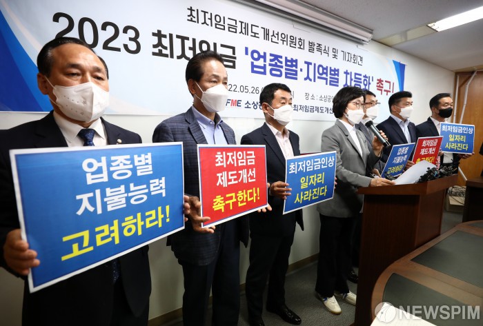 [서울=뉴스핌] 정일구 기자 = 오세희 소상공인연합회 회장이 26일 오후 서울 여의도 소상공인연합회에서 열린 최저임금 업종별·지역별 차등화 촉구를 위한 소상공인연합회·최저임금제도개선위원회 기자회견에서 발언을 하고 있다. 2022.05.26 mironj19@newspim.com