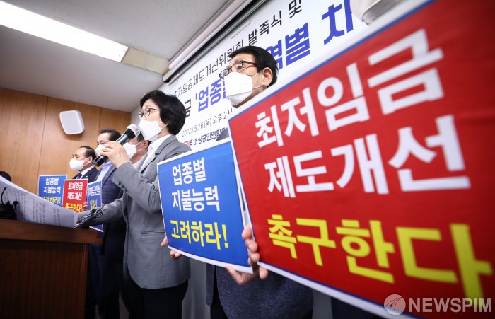 [서울=뉴스핌] 정일구 기자 = 오세희 소상공인연합회 회장이 26일 오후 서울 여의도 소상공인연합회에서 열린 최저임금 업종별·지역별 차등화 촉구를 위한 소상공인연합회·최저임금제도개선위원회 기자회견에서 발언을 하고 있다. 2022.05.26 mironj19@newspim.com