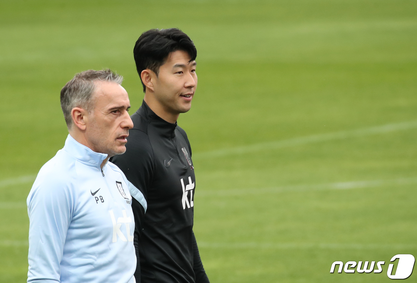 축구 국가대표 손흥민이 30일 오후 경기 파주국가대표트레이닝센터(NFC)에서 열린 오픈 트레이닝에서 파울루 벤투 감독과 대화를 하고 있다.022.5.30/뉴스1 © News1 송원영 기자 |