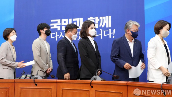 [서울=뉴스핌] 김민지 기자 = 윤호중, 박지현 더불어민주당 공동비상대책위원장이 2일 오전 국회에서 사퇴 의사를 밝힌 뒤 회의장을 나서고 있다. 이날 민주당 비대위는 6·1 지방선거 패배에 대한 책임을 지고 총사퇴 하겠다는 의사를 밝혔다. 2022.06.02 kimkim@newspim.com