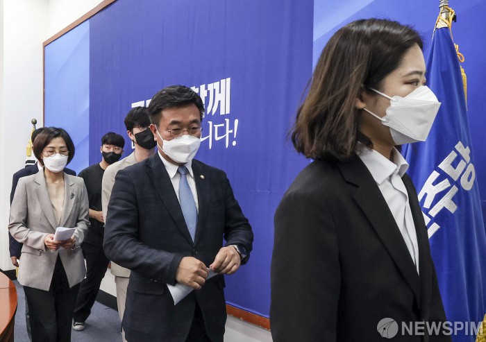 [서울=뉴스핌] 김민지 기자 = 윤호중, 박지현 더불어민주당 공동비상대책위원장이 2일 오전 국회에서 사퇴 의사를 밝힌 뒤 회의장을 나서고 있다. 이날 민주당 비대위는 6·1 지방선거 패배에 대한 책임을 지고 총사퇴 하겠다는 의사를 밝혔다. 2022.06.02 kimkim@newspim.com