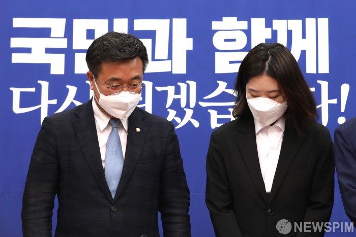 [서울=뉴스핌] 김민지 기자 = 윤호중, 박지현 더불어민주당 공동비상대책위원장이 2일 오전 국회에서 지방선거 패배 책임에 대한 사퇴 의사를 밝히고 있다. 2022.06.02 kimkim@newspim.com