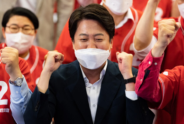 이준석 국민의힘 대표가 지난 1일 서울 여의도 국회 도서관에 마련된 제8회 지방선거 개표상황실에서 출구조사 방송을 시청하며 기뻐하고 있다. (사진=국회사진기자단) |
