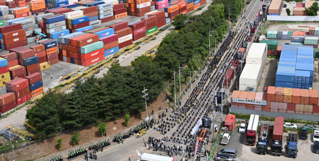 7일 경기도 의왕시 내륙컨테이너기지(ICD) 앞에서 열린 화물연대 서울경기지부 총파업 출정식에서 노조원들이 자리하고 있다. 전국민주노동조합총연맹(민주노총) 산하 공공운수노조 화물연대본부는 화물자동차 안전 운임제 일몰 폐지 및 확대, 고유가에 따른 운송료 인상 등을 요구하며 이날 0시부터 무기한·전면 총파업에 돌입했다.