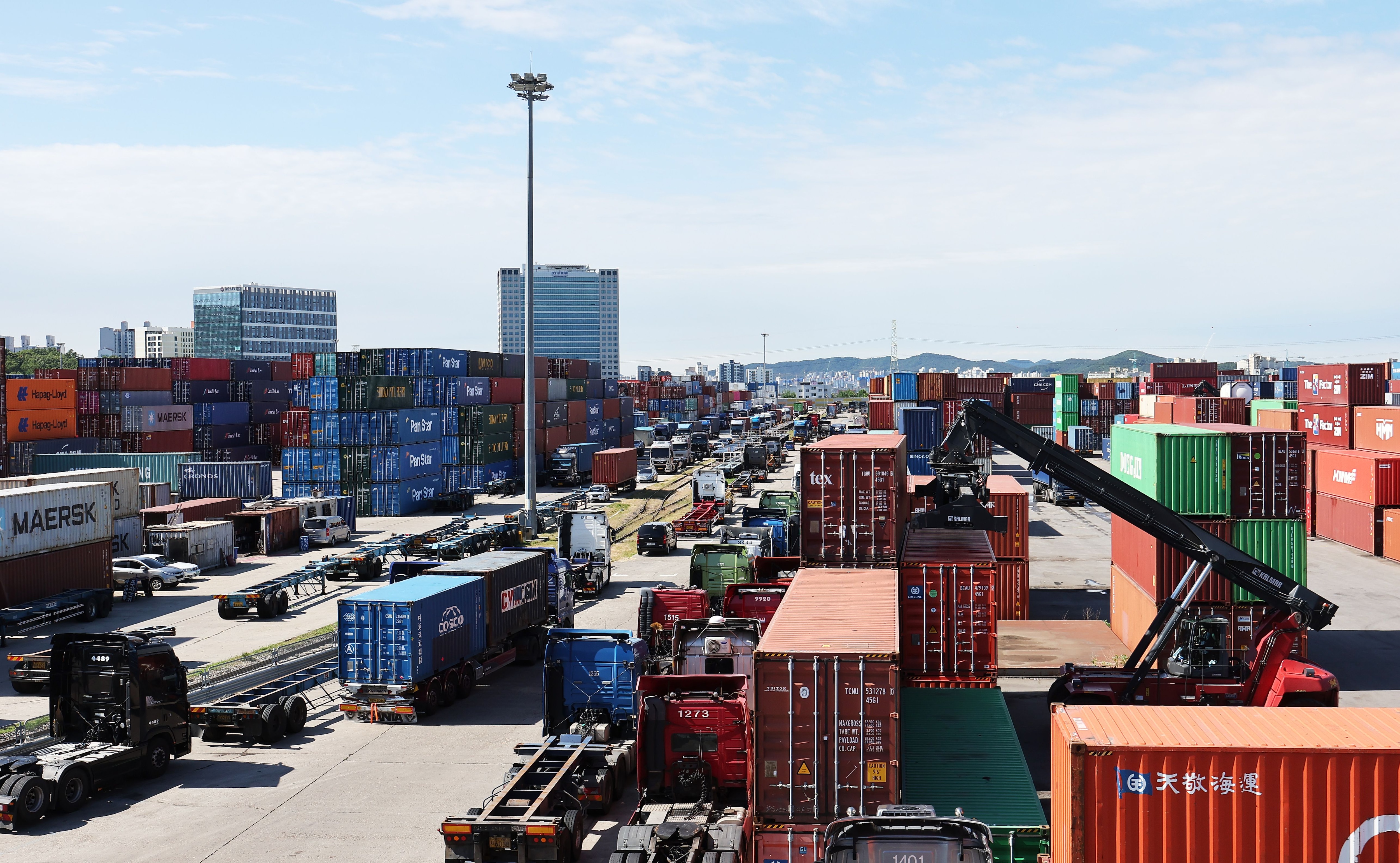 화물연대가 총파업에 돌입한 7일 경기도 의왕시 내륙컨테이너기지(ICD)에 화물차들이 주차돼 있다./연합뉴스 |