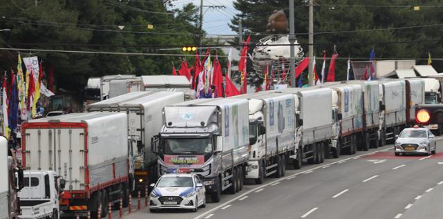 화물연대와 국토교통부 등에 따르면 화물연대는 이날 오전 부산·인천·경남 등 전국 12개 지역에서 지부별 총파업 출정식을 진행했다. 국토부는 9,000여 명, 화물연대는 1만5,000여 명이 출정식에 참여한 것으로 각각 집계했다. 화물연대 관계자는 "주요 거점을 지키고 있는 조합원을 제외한 인원들이 출정식에 참여했고, 파업에는 전체 조합원(2만5,000여 명) 대부분이 함께하고 있다"고 했다.