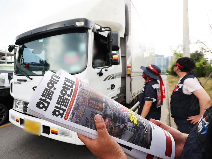 화물연대 총파업 이틀째인 8일 오후 경기도 광명시 기아 오토랜드 광명 앞에서 조합원들이 홍보활동을 하고 있다. 연합뉴스. |