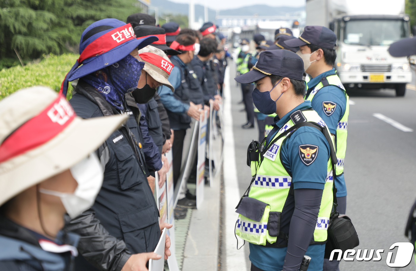 화물연대 총파업 이틀째인 8일 울산시 북구 현대자동차 명촌정문 앞에서 화물연대 울산본부 소속 조합원들이 경찰과 대치하고 있다. 2022.6.8/뉴스1 © News1 조민주 기자 |