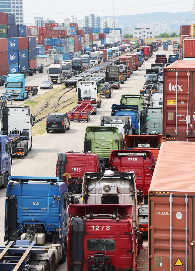 화물연대 총파업 이틀째인 8일 오전 경기도 의왕시 내륙컨테이너기지(ICD)에 화물차들이 멈춰 서 있다. /사진 = 연합뉴스 |