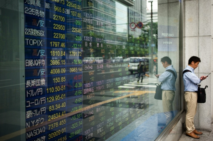 일본 도쿄증권거래소에 상장된 일본 기업들의 주가가 표시된 주가지표 옆에 한 남성이 서 있다. (C) AFP=뉴스1 |