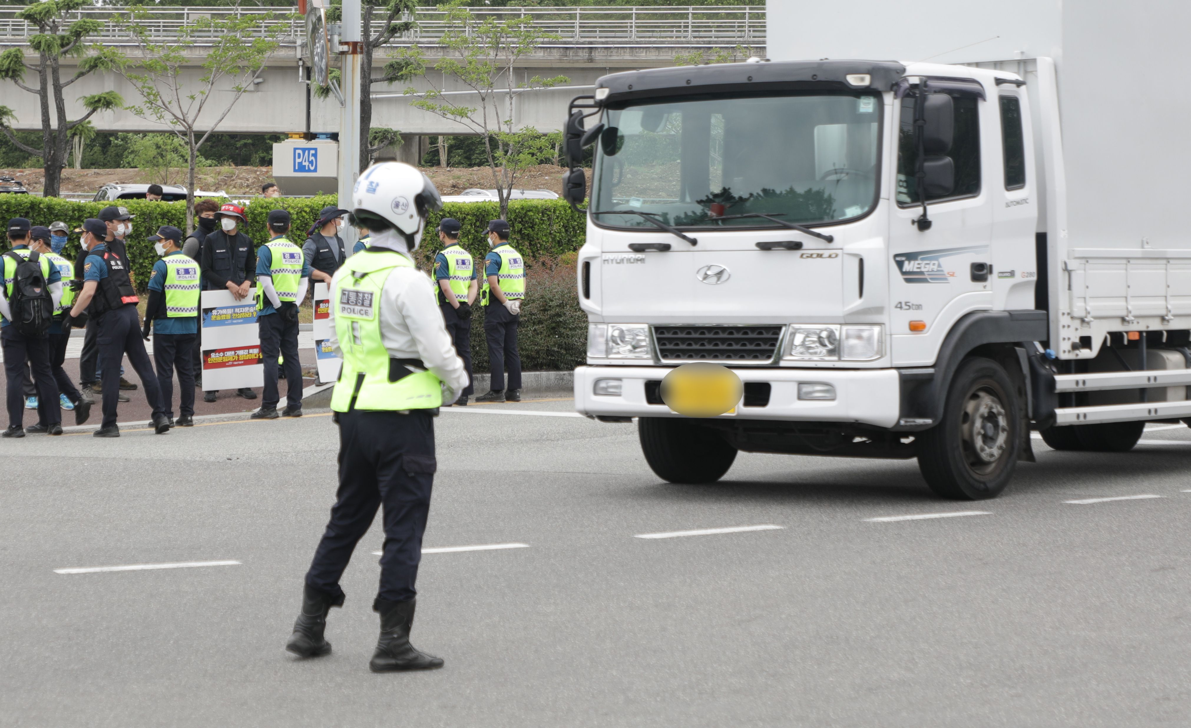 화물연대 총파업 이틀째인 8일 울산시 북구 현대자동차 명촌정문 앞에서 화물연대 울산본부 소속 조합원들이 경찰과 대치하고 있다./뉴스1 |