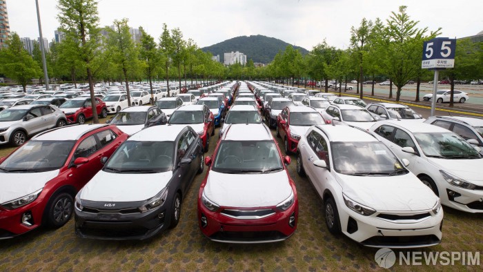 [광명=뉴스핌] 윤창빈 기자 = 화물연대 총파업이 장기화로 이어지고 있는 13일 오후 경기 광명시 광명스피돔 주차장에 항구로 옮겨지지 못한 수출용 자동차들이 임시 주차돼 있다. 2022.06.13 pangbin@newspim.com