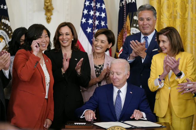 그레이스 멩 민주당 하원의원(왼쪽)이 조 바이든 대통령이 13일 오후(현지시간) 백악관 이스트룸에서 국립 아시아·태평양 미국인 역사문화 박물관 설립을 검토하는 위원회를 구성하는 것을 골자로 한 법안(H.R.3525)에 서명한 펜을 들어보이고 있다. 이에 카멀라 해리스 부통령(왼쪽부터)·영 김 공화당 하원의원·마크 타카노 민주당 하원의원·낸시 펠로시 하원의장 등이 박수를 치고 있다./사진=AP=연합뉴스 |