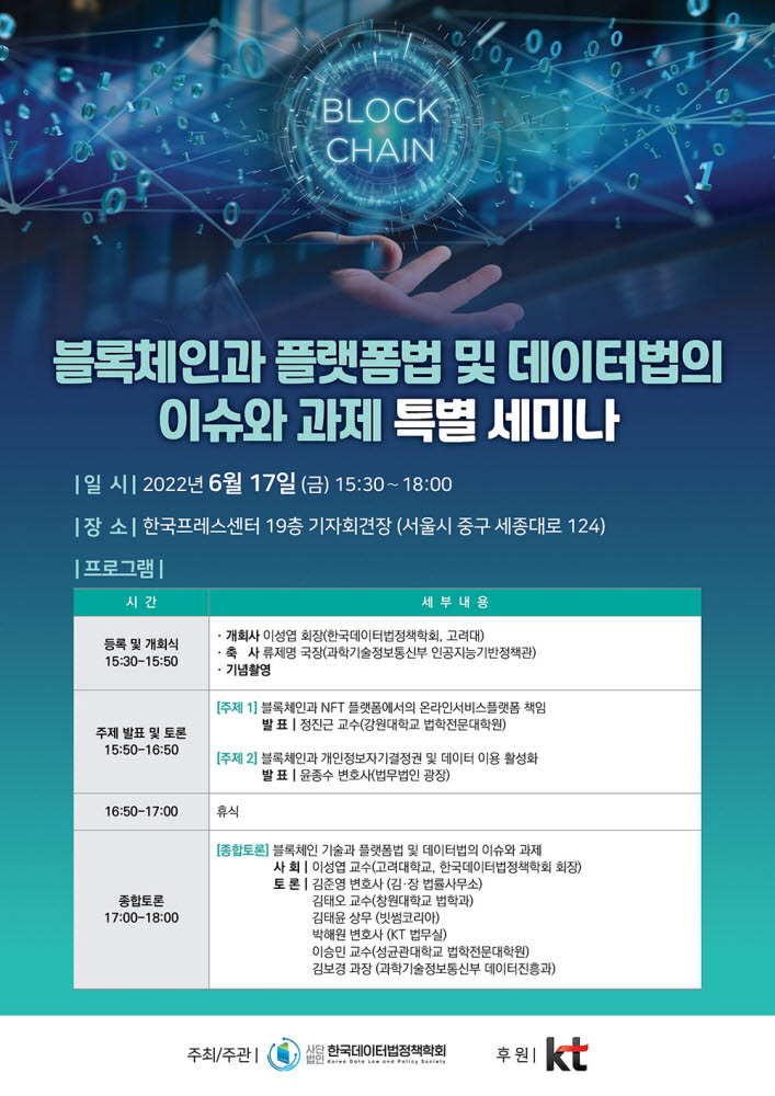 한국데이터법정책학회는 KT 후원으로 17일 서울 프레스센터 19층 기자회견장에서 '블록체인과 플랫폼법 및 데이터법의 이슈와 과제'를 주제로 세미나를 개최한다.