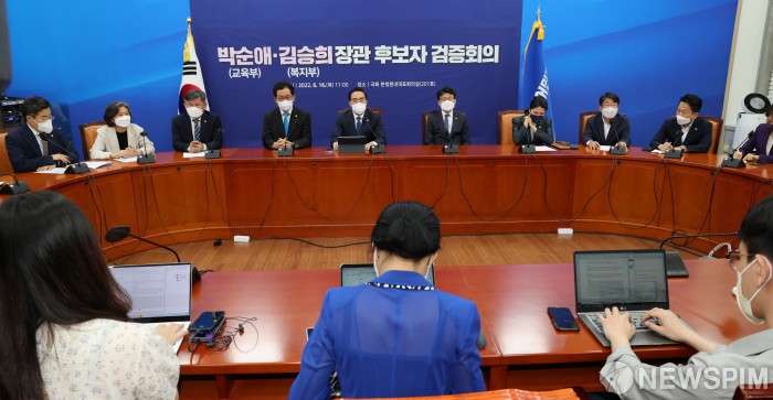 그러면서 "검증 시스템의 취약성을 다시 한 번 확인할 수 있는 후보자들"이라며 "바이든 미 대통령의 방한 당시 외신 기자가 여성 관료가 없다고 지적한 이유만으로 후보자 검증도 없이 장관 후보자를 지명한 것 아닌가"라며 공세를 펼쳤다.