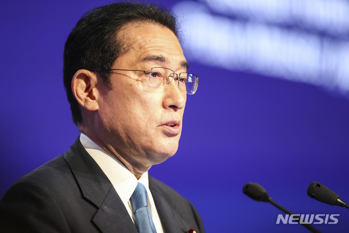 [샹그릴라=AP/뉴시스] 기시다 후미오 일본 총리가 지난 10일 싱가포르 샹그릴라에서 열린 아시아안보포럼(샹그릴라 대화)에서 기조연설을 하고 있다. 2022.06.20. |