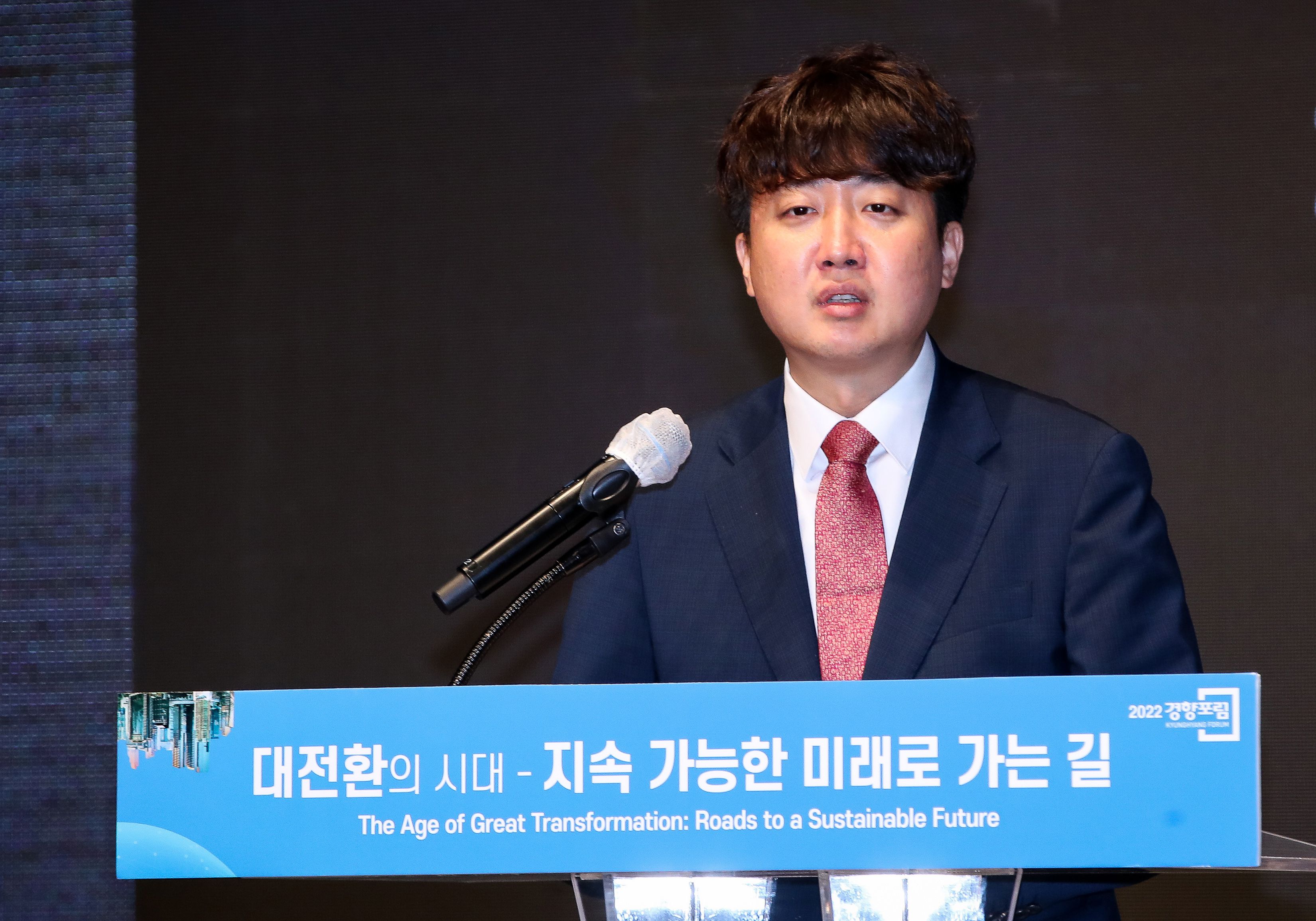 이준석 국민의힘 대표가 22일 서울 중구 롯데호텔에서 열린 '2022 경향포럼'에서 축사를 하고 있다. /뉴스1 |