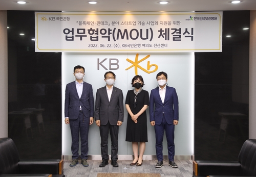 (서울=연합뉴스) 임성호 기자 = 한국인터넷진흥원(KISA)은 KB국민은행과 '블록체인·핀테크 스타트업 기술 사업화 지원' 업무협약을 22일 체결했다고 밝혔다.