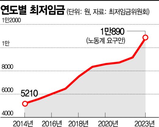 한국경영자총협회(경총) 역시 "최근 고물가·고금리·고환율의 삼중고와 생산·소비·투자의 감소 등 각종 거시경제 악재가 한꺼번에 몰아치며 '퍼팩트 스톰'의 위기에 직면한 상황"이라며 동결을 요구했다. 경총은 2017년부터 지난해까지의 최저임금 인상률은 누적 44.6%이지만 1인당 노동생산성은 4.3% 증가한 것을 고려하면 최저임금 인상 요인도 없다고 설명했다.