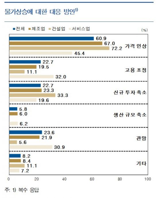 향후 물가상승에 대해선 '가격 인상(61%)'으로 대응하겠다는 응답이 가장 많았다. 다만 서비스업에서는 '가격 인상(45%)'과 함께 '고용 조정(32%)'으로 대응하겠다는 응답도 높은 비율을 차지했다.