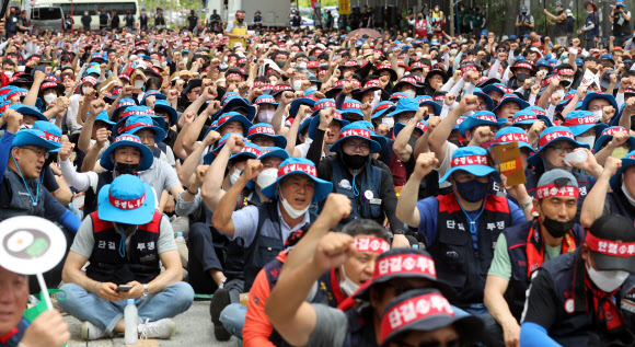 양대 노총 고용부 앞에서 “최저임금 올려라” - 민주노총과 한국노총이 28일 세종시 정부세종청사 고용노동부 앞에서 집회를 열고 2023년도 최저임금 인상을 촉구하고 있다.세종 뉴시스 |