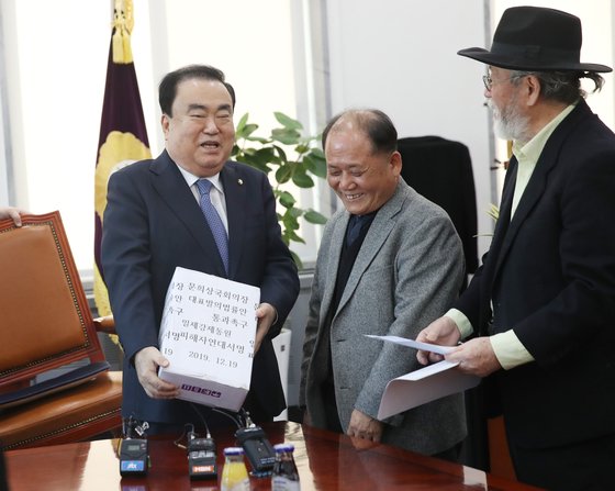 2019년 일제강제동원희생자유가족협동조합 등 3개 단체 회원들이 당시 문희상 국회의장이 대표발의한 '일제 강제징용 피해 배상 기금 마련 법률안', 일명 '문희상안' 통과를 촉구하는 연대 서명을 전달하는 모습. [연합뉴스] |