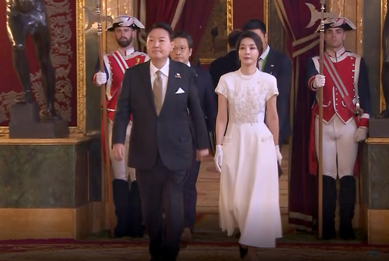(마드리드=뉴스1) 오대일 기자 = 윤석열 대통령과 김건희 여사가 28일(현지시간) 스페인 마드리드 왕궁에서 열린 펠리페 6세 스페인 국왕 내외 주최 만찬에 참석하고 있다. (나토정상회의 사무국 영상 캡쳐) 2022.6.29/뉴스1 |