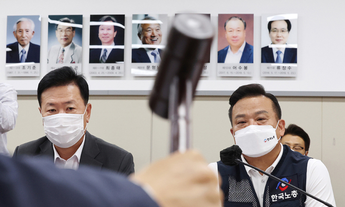 지난 28일 세종시 정부세종청사 최저임금위원회 회의실에서 열린 제7차 전원회의에서 사용자위원인 류기정 한국경영자총협회 전무(왼쪽)와 근로자위원인 이동호 한국노총 사무총장이 박준식 위원장의 개의를 바라보고 있다. 연합뉴스 |