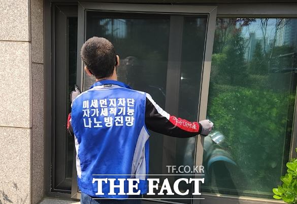 어르신 이용시설에 미세먼지 차단방지망을 설치하고 있다./구리시청 제공 |