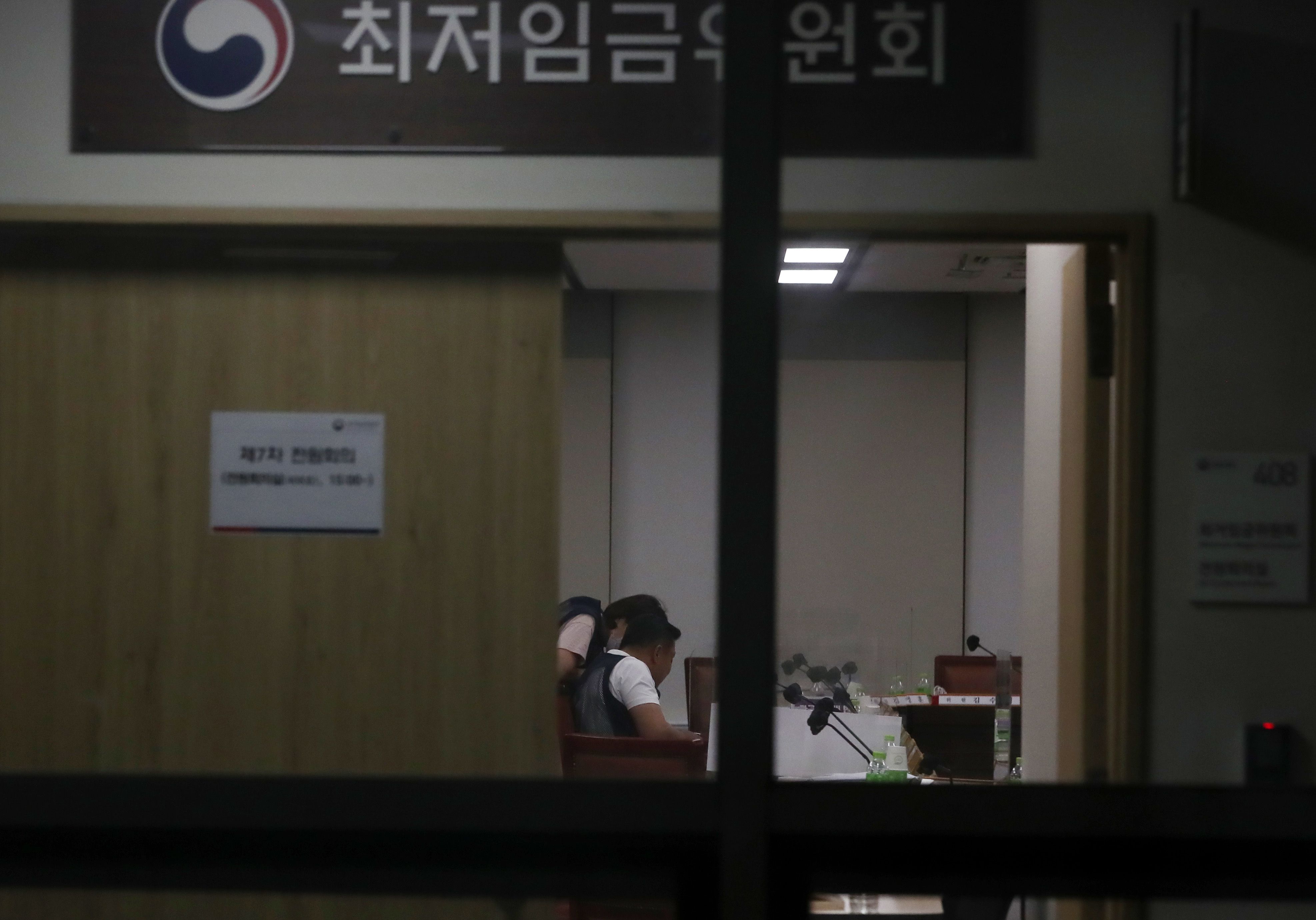 28일 밤 정부세종청사 최저임금위원회 회의실에서 열린 제7차 전원회의에서 회의가 중단 된 채 양측이 팽팽한 줄다리기를 하고 있다. /뉴스1 |