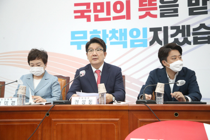 권성동 국민의힘 원내대표(가운데)가 4일 국회에서 열린 최고위원회의에서 발언하고 있다. 오른쪽은 이준석 대표, 왼쪽은 정미경 최고위원. 국회사진기자단 |