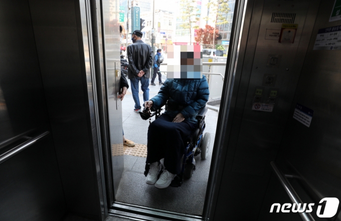 1급지체장애인이서울 중구 을지로3가역에서 지하철을 이용하기 위해 승강기에 오르고 있다. 기사내용과 무관./사진=뉴스1 |