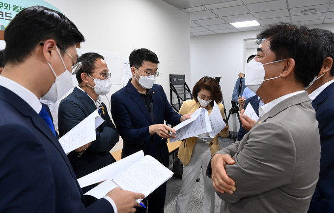 친명계 기자회견 준비 더불어민주당 박주민(왼쪽 두번째, 시계방향으로), 김남국, 양이원영, 김병욱 의원 등이 5일 서울 여의도 국회 소통관에서 전당대회 룰과 관련한 기자회견을 하기 앞서 대화를 나누고 있다. 허정호 선임기자 |